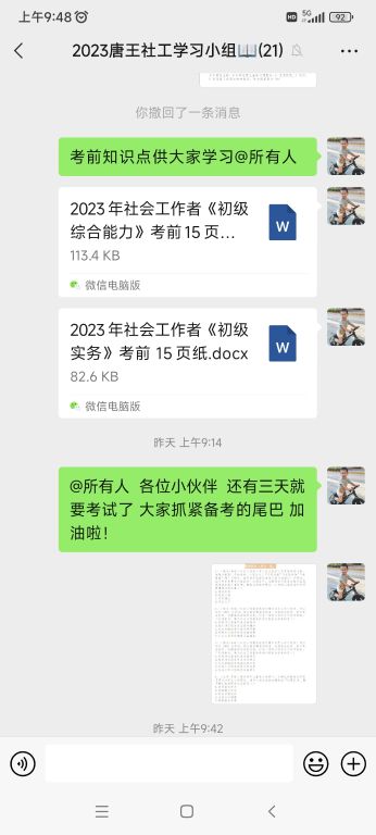 2023年社会工作者职业水平考试马上开始,6月9日,唐王街道社工站在互助学习群里发布了最后一次“每日一练”题目后,标志着“赋能提升 助力成长”社工互助学习小组圆满结束。该学习互助小组一直采用“线上+线下”的形式开展,共为辖区21位报考者提供了为期2个月的学习交流机会。