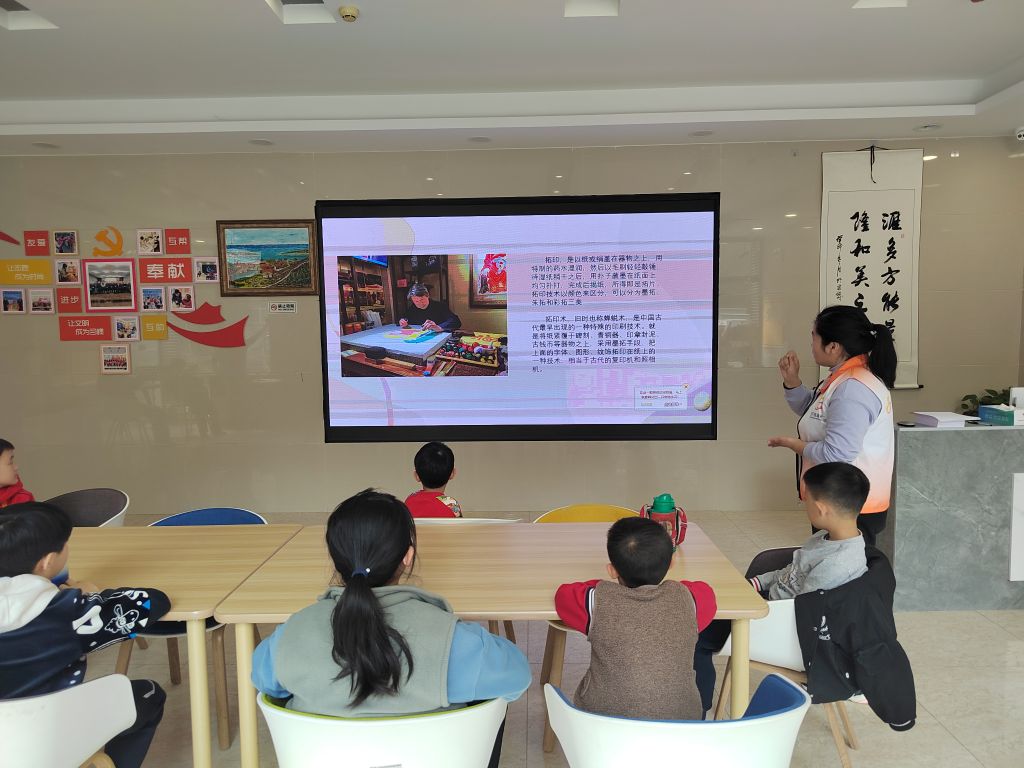 第二节小组活动名为“一起“趣”拓印”。社工带领儿童一起体验拓印的趣味,感受非遗传统文化的魅力。社工首先讲述了拓印的起源和发展,以及制作过程和注意事项,每个孩子都听得津津有味,表现出了对拓印文化的兴趣。随后,孩子们一起动手体验了刷墨、覆纸、刷印等拓印流程,认真地将模板涂抹颜料,在纸卷上进行“印刷”。孩子们看到自己亲手制作的成品跃然纸上,如获至宝,都露出了满意的笑容。孩子的小手是灵巧的,件件作品皆有味。孩子们通过这次活动感受到了非遗拓印的独有魅力,传承中国经典国粹,提升了儿童的文化自信心。