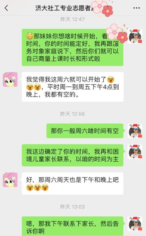 七贤驻站社工力量毕竟薄弱,青少年线上服务具有一定专业性,社工发挥联动性,寻找合适志愿者帮助开展服务。现阶段,驻站社工已联系到济南大学学生志愿者,和低保家庭儿童已对接,预计12月10日开展第一次线上学习辅导,驻站社工会将服务过程及时记录下来,做好总结反思。