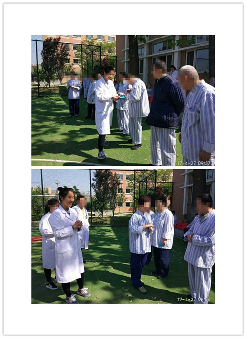 2017年4月27日上午驻济南市优抚医院社工在康复中心带领各位康复员在户外做了一个小小的趣味游戏:这是谁的家。 活动开始前,社工向各位康复员介绍游戏说明,将准备好代表动物的标签放在康复员手里,选出一名代表敲敲与自己相同动物的“家”,动物标签有猫,狗,青蛙,鸡。代表用敬语敲出自己的动物标签,康复员需要用声音表达出自己的标签。活动开始,只见康复员代表的羞怯的开始敲起来门,当当当,请问你是谁的家啊?被敲到的康复员“呱呱”“哦对不起敲错了”继续寻找下一个与自己一样的标签为止。活动过程中大家有说有笑,趣味小游戏不仅锻炼康复员大脑,也为枯燥的休养生活带来了乐趣。活动结束,社工引导分享。