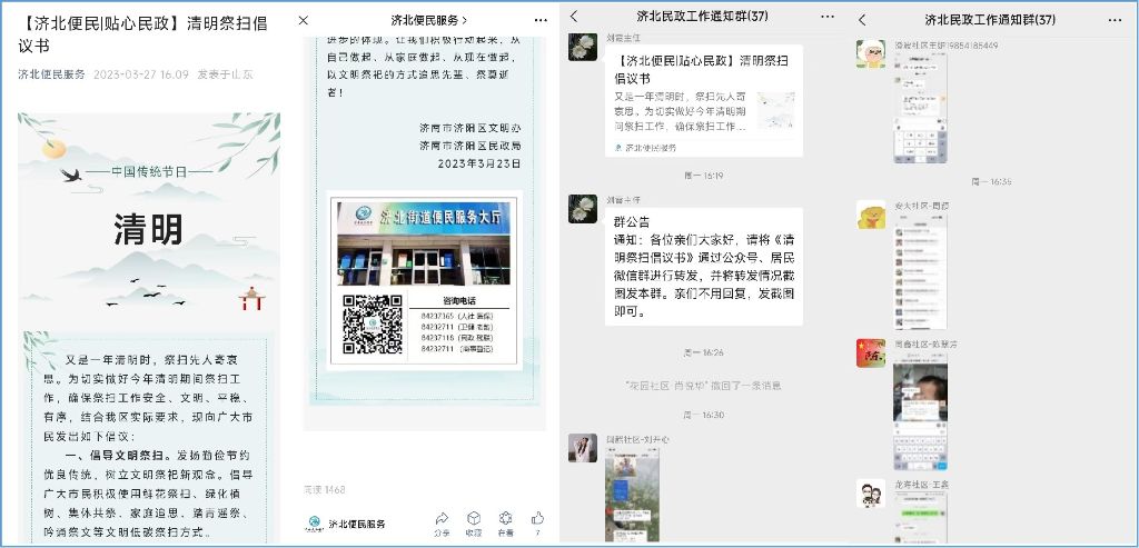清明节是我国缅怀先人,悼念逝者,寄托衰思的传统节日,为了引导居民移风易俗,以现代文明的理念、温馨和谐的方式开展祭祀活动,济北街道社工站于清明节前夕开展了“文明祭祀进社区”活动。通过线上+线下的双重模式进行宣传,号召大家积极营造“文明祭扫,平安清明”的节日氛围。