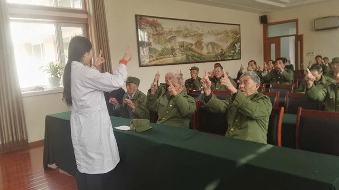 12日,因为天气转凉,社工根据天气变化,将晨间的户外保健操改为室内手指操。活动在“卖鸡蛋”和“一枪打六个”兼具游戏趣味性与健身性的手指操中开启,优抚对象在嬉笑中提升了学习的兴趣,随后社工又教授大家握拳双击、掌外侧击、拳心相向等13节手指操,优抚对象都非常喜欢,做完整套后,优抚对象表示:“看着动作挺简单、轻松,做完都出汗。”