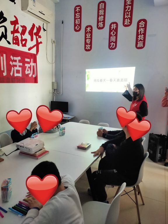 活动开始前,社工引导10名自闭症儿童安静有序的坐好。社工首先进行了自我介绍,然后讲解了本节小组活动的主题-“寻找春天,春天真美丽”。与社工们设想的一样,一开始就牵星宝的手和他们亲近是很难做到的,因为星宝们不愿意和陌生人接触,所以社工们先与星宝们保持距离,通过唱歌、跳舞的方式来逐步消除对社工的陌生感。接下来,为了小组活动能够井然有序的推进,社工带领小组成员一起制定了小组规则,小组成员依次签名,保证遵守小组的约定。社工们带领星宝,把自己的签名贴在了教室的显眼处。最后,社工们给星宝分享春天的美好,引导星宝把自己心目中的春天画出来。