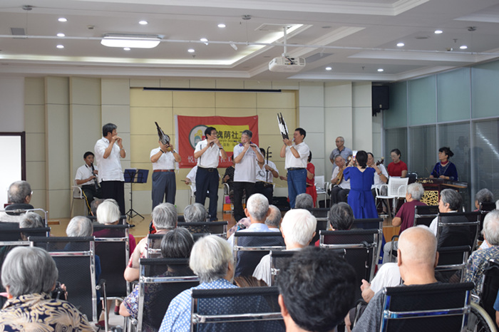 八月的尾巴,初秋,天高云淡,微风开始纷至沓来,没有了七月末的狂热,没有了从内到外的浮躁,这样的天气凉爽宜人。八点,志愿者们就赶到了多功能厅里认真的开始了准备工作,歌声、琴声和笛声响彻满屋,好生热闹。上午九时,演出开始,歌曲《我和我的祖国》、《父亲》、《我们的生活充满阳光》和《草原上升起不落的太阳》歌声嘹亮绕耳,暖人心弦;舞蹈《祝福祖国》和《非洲鼓舞》舞姿优美,动作活泼,深受老人喜欢;笛子演奏《化蝶》和《北风吹》,笛声悠扬,悦耳动听,怡人心脾。最后,演出在合奏《喜洋洋》的欢快节奏中结束。