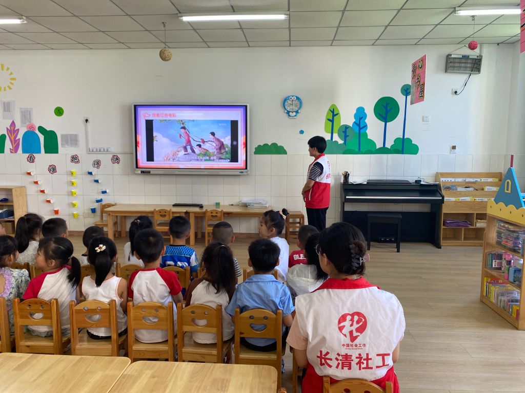 随后,社工充分发挥幼儿的主观能动性,通过便于理解的视频和图片形式,讲述了《王二小》《刘胡兰》《小萝卜头宋振中》等红色故事,让幼儿学习了党史,这些故事不仅让幼儿们重温了革命先驱的英勇事迹,感受到今天美好生活的来之不易,更在其心中播下了爱国爱家的种子,让他们生动形象地接受了一次爱国主义教育和革命传统教育。