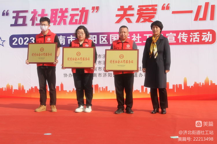 本活动在济北街道安大广场举行。济阳区民政局党组成员、副局长许春丽,济北街道党工委委员、副主任王春晓,济阳街道党工委委员、副主任李洪滨等共同出席本次活动。活动中,首先由区民政局党组成员、副局长许春丽同志致开幕词。她高度肯定了济阳区社工站的建设工作,并为广大社工提出了新的希望和要求。本次活动中,垛石街道社工站荣获区级“优秀社会工作服务站”荣誉,区民政局副局长许春丽为荣获该项荣誉的三个社工站颁发了奖牌。