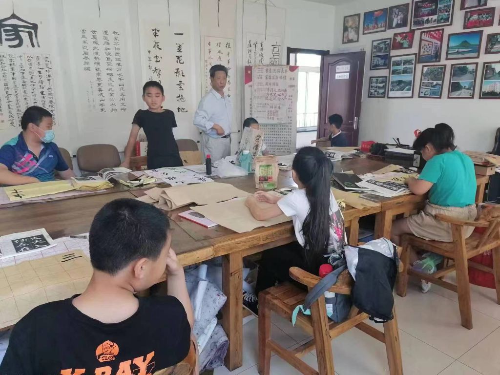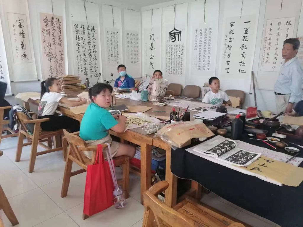 社工为孩子们准备好笔墨纸砚,维持好秩序,生动有趣的书法课就开始了。书法老师向孩子们讲解和示范如何正确执笔、如何正确坐姿,孩子们对书法学习兴趣浓郁,一个个仔细听着老师的讲解,目不转睛地看着老师亲笔示范,劲头十足。有的孩子从未接触过书法,显得有些胆怯,但在社工的鼓励下愿意尝试先在宣纸上临摹练习,由于每个孩子的学习进度不同,老师便让学习进度快的孩子会帮助其他孩子,大家互相交流,学习气氛十分融洽。