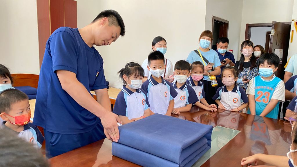 消防员的宿舍内务摆放整齐划一,井井有条,尤其是被子叠得像“豆腐块”一样,孩子们刚进门就被吸引,忍不住惊叹“好整齐啊!”在惊叹声中,消防员叔叔演示了一遍如何叠出“豆腐块”被子,每天重复的整理让被子已经出现了明显的折痕,只一会儿的工夫,一个规整的方块被子就出现了,孩子们都惊呆了,连声夸赞消防员叔叔实在是太厉害了。