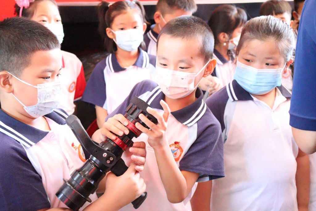 走进消防中队,消防员叔叔带孩子们来到消防车的面前,孩子们对面前熟悉又陌生的消防车充满好奇心,带着大家的期待,消防员叔叔向大家介绍了消防车里的“宝贝”,破拆工具、水箱、分水器、水带等,孩子们还见识到了可以伸展42米的云梯,并亲手感受了水枪的重量,沉甸甸的水枪配上灌满水的水带,孩子们惊叹于消防员叔叔力量的同时,也在体会着这项工作的辛苦。