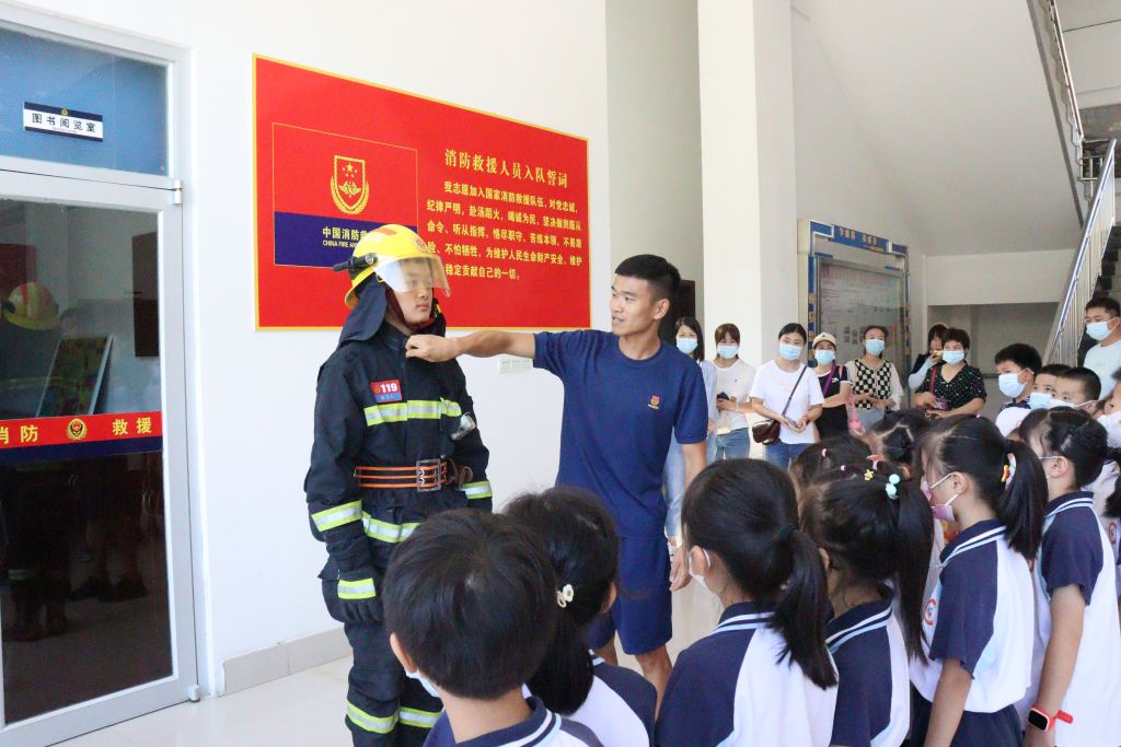 “每个消防员配有警报器,如果消防员静止时间超过30秒,它就会自动报警,标识位置,通过这种方式告知我们消防员遇到了危险”,消防员叔叔边介绍边拿出背后包里的绳子,一条长达20米的安全绳,这条绳子不仅是用来救人的,关键时刻能充当消防员生命的“最后一道防线”。接着消防员叔叔邀请孩子们亲自穿上消防服体验,沉浸式感受消防员的职业,孩子们跃跃欲试,沉重的消防服压在孩子的身上,这也让孩子们体会到消防员在面对火灾时,不仅救援现场考验着他们,本身承担的沉重装备也在消耗着消防员的体力,这项工作是伟大而又辛苦的。