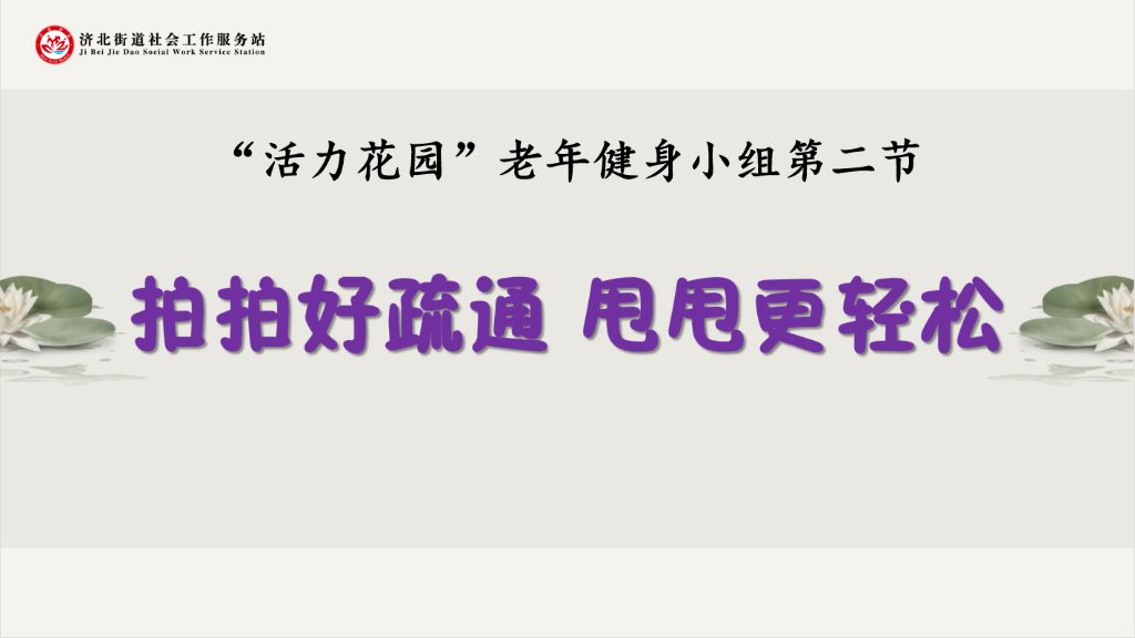 4月26日下午,济北街道社工站在花园社区开展的“活力花园”老年健身小组第二节活动顺利开课,本节活动的设计主题是“拍拍好疏通,甩甩更轻松”。