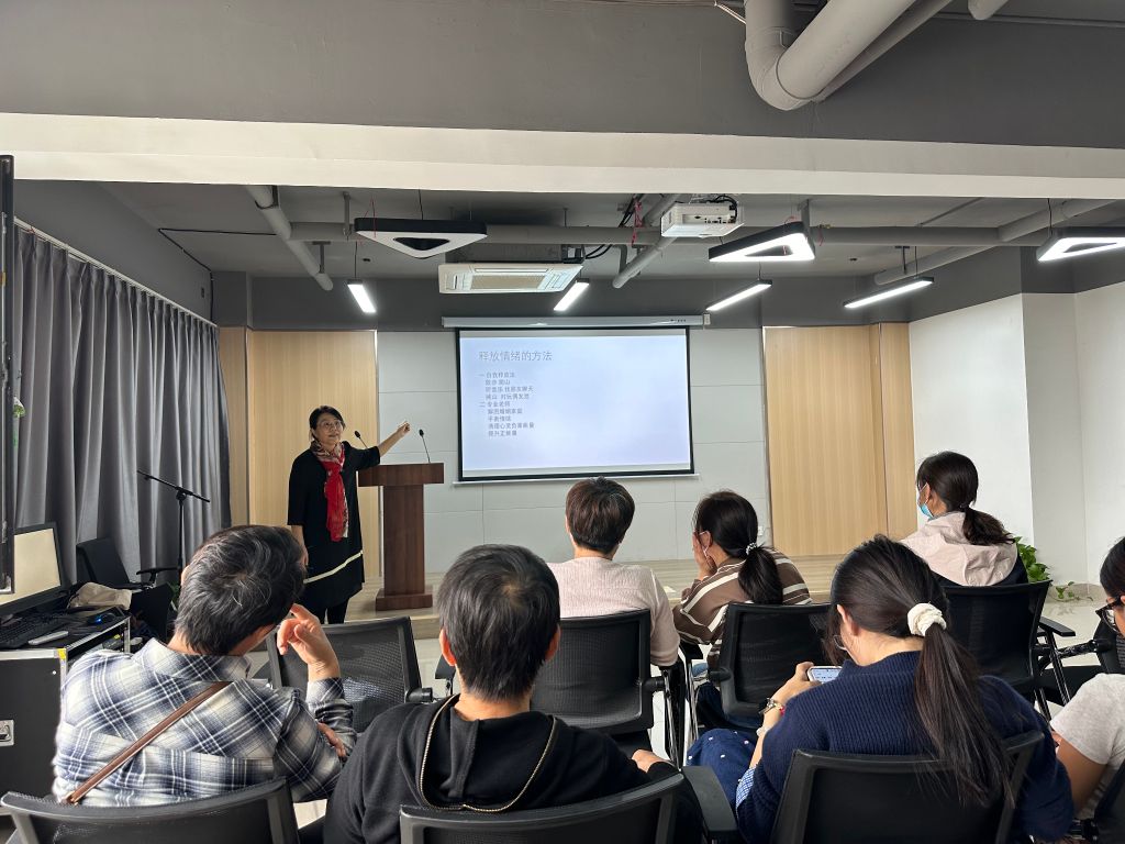 此外,讲座还涉及情志与五脏的对应关系,使居民们了解到情绪对身体的影响。在此基础上,苏老师进一步介绍了释放情绪的方法。自我释放法包括散步、爬山、听音乐、找朋友聊天、喊山、对玩偶发泄等;寻求专业老师帮助则涵盖解困婚姻家庭、平衡情绪、清理心灵负面能量、提升正能量等方面。