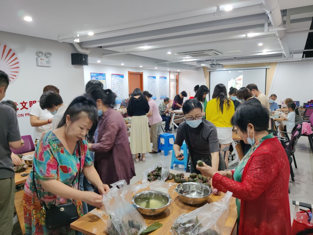 社工先向社区居民讲解了端午节的来历、习俗以及包粽子的要点和注意事项。随后社工将事先准备好的粽叶、糯米以及各种馅料分发给大家,有的剪粽叶、有的编粽绳、有的分糯米。翠绿的粽叶在居民们灵巧的手中翻飞,填糯米、加料、压实、封口、扎捆,动作麻利,一气呵成,一个个香甜软糯的粽子也寄托着居民对节日的美好祝愿。活动现场其乐融融,充满了欢声笑语,氛围和谐又热闹。
