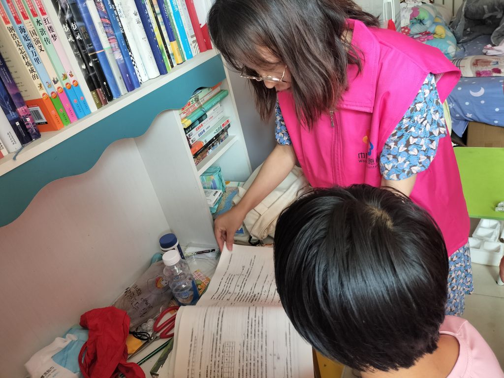 炎炎夏日,为了解决困境儿童“看护难、辅导难”问题,帮助困境儿童暑期在学业上不掉队,近日,韩庙镇社工站邀请有教师资格证志愿者上门为困境儿童提供学业辅导。社工小杨和志愿者敲开了一户户困境儿童的家门,认真查看孩子们的作业书写情况,帮助孩子们讲解难题、错题;和家长真诚沟通,了解孩子的生活情况。