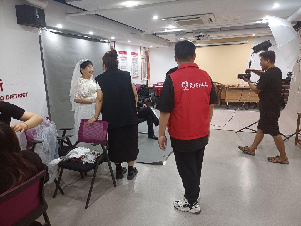 活动现场,社工与摄影机构志愿者分工协作,配合默契,一切井然有序。化妆师陪同前来参加活动的每位老人挑选好礼服,并化好精致的妆容。随后,摄影师耐心地与老人沟通,教大家如何摆姿势。“放松,不要紧张,面带笑容……”面对镜头,叔叔阿姨们脸上洋溢着幸福的笑容。随着摄影师手中相机的“咔咔”声,十几对老年伴侣将各自美丽的瞬间定格。参加活动的张叔叔说道:“以前结婚只有一张黑白照片,跟老伴过了几十年都没有真正穿过婚纱、礼服,这次能圆了我们的婚纱梦,太谢谢社工了。