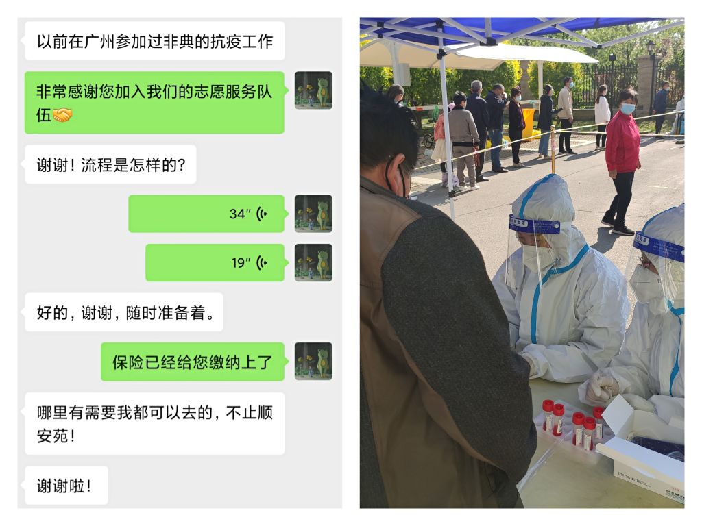 疫情防控中志愿者的力量不容忽视,兴福站发挥动员能力,在一线防疫中不忘志愿者的招募,精准遴选、统一管理。防疫志愿服务和日常志愿服务有所不同,其中最重要一点就是做好志愿者的安全保障。“我以前在广州参加过非典的抗疫工作,随时准备着!”“孩子白天自己在家就可以,我想到一线为防疫尽自己微薄之力”,志愿者们来自各行各业、过着不同的生活,在疫情来临时,选择了挺身而出为家园筑起防控的屏障,面对这些怀揣着满腔热情而来的志愿者,社工深深感动,招募到志愿者社工第一时间联系相关工作人员为志愿者统一购买相应的保险,并且为每位志愿者发放口罩、酒精等防疫物资并讲解安全防疫知识,确保每位志愿者有安全防护意识,能够保障居民和自身的安全。细数疫情防控的每一个瞬间,社工携志愿者怀揣着信心与勇气奋斗在防疫第一线,科学防疫,用爱守护着这座城。