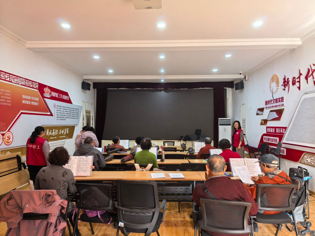 在讲解音乐术语和记谱法时,社工们在教室里来回忙碌,细心地为每一位老人分发资料。他们将资料递到老人手中,轻声提醒:“赵阿姨,您戴上老花镜慢慢看,要是有不懂的地方,随时叫我。”对于视力不好的老人,社工则贴心地坐在旁边,逐字逐句念给他们听,还结合老师的讲解进行详细阐释,确保老人们能跟上学习进度。