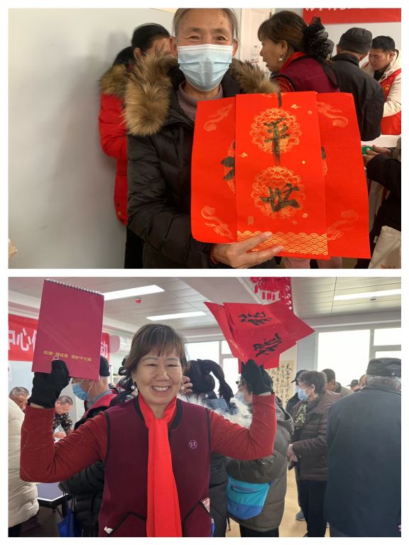 活动现场,社工们和辖区的书法爱好者们齐上阵, 楷书、隶书、行书等各种字体随墨香飘扬,一张张喜气洋洋的"福"字和一副副飘散着清新墨香的春联接连完成。随后,社工们也把写着“福”字和饱含幸福、温情的春联凝聚成一份份真挚祝福送给前来的居民。