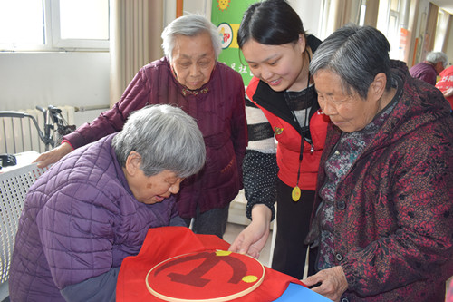 住养老人围在桌前,对着旗帜穿针引线。有的老人坐着轮椅行动不便,仍旧坚持亲自动手参与;有的老人年近百岁视力衰退,仍然认真专注,穿针走线一丝不苟。他们将敬党爱党之情一针一针绣进鲜红的旗帜里,每个住养老人的脸上都洋溢着幸福的笑容。