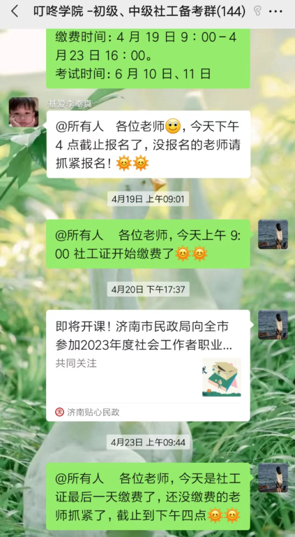 2.为进一步提高社区工作者专业水平,让更多人社区居民走近社工,了解社工。为此,在趵突泉街道办事处及下辖六社区与社工站的多次沟通协调下,针对想要考取初、中级社工证的工作人员及社区居民进行建群、时间规划与提醒、考情分析及学习指导等多项工作。截至四月底,共计服务144人。
