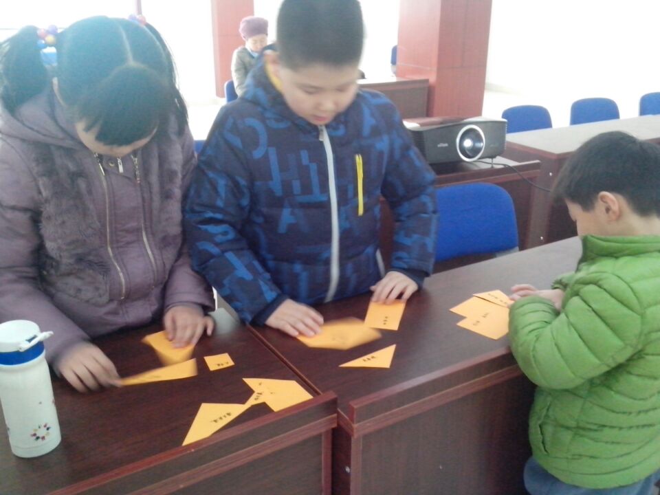 “你堆我砌悟国学”环节,组员们4人一组共三组,每组队长各领一个信封,里面装有12张碎片,选自《弟子规》、《论语》、《老子》、《诗经》、《左传》等国学经典词句。工作员随机给每位组员发放三片,虽然三张碎片的数量是能够组成一个完整的正方形,但是由于随机发放,每人手中的三张却不是一个正方形的碎片,而其他队员会有自己的正方形碎片,组员们根据图形碎片形状与国学词语的排序把碎片组合成正方形。规则是:只能主动给予碎片给队友,不能向队友索取。哪组四名成员用时最短并把手中的碎片拼成正方形就算胜出。在堆砌的过程中大部分的组员能够看到别人的需求主动把自己手中的正方形碎片给别人,个别的组员,攥着手里的碎片犹豫不决。最后能够主动舍弃自己手中碎片给予他人的组员也把自己手中的正方形碎片拼好,而犹豫着不舍的给予他人的组员面前始终摆放着孤单的碎片。工作员为组员联系游戏解释了“成人之美”与“成人之善”两个成语,引导组员们思考和讨论。