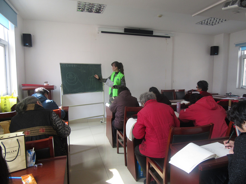 志愿者引导老年人签到并给家庭作业加盖评定奖章,上课开始后,志愿者给老人讲解了学习内容,引导学员划分画纸比例,分解学习任务。为了让学员更好地掌握绘画形象,志愿者把生活故事融入到授课内容中,增加了生动性和趣味性。