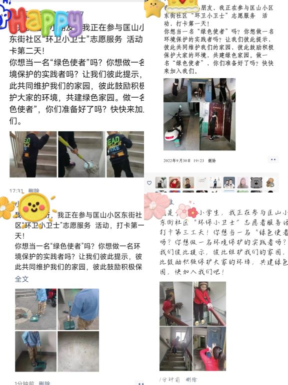 匡山街道社工站通过在“环保小卫士”微信群打卡的方式,鼓励青少年积极参与社区卫生环境保护志愿活动。社工在群内发布线上活动通知,孩子们根据通知要求清理楼道垃圾、监督不文明现象、参与社区治理,同时将活动照片上传到微信群内,并同步转发到朋友圈带动身边的人一起参与环保志愿服务。孩子们通过集赞的形式获取志愿积分,在活动结束时兑换相应的社工站服务及荣誉证书。活动开始以来受到了家长和青少年的积极追捧,不仅能让青少年参与到社区活动中,打卡的形式更是促进了青少年之间的相互交流,接下来还有更加精彩的线上互动板块等着大家打卡。