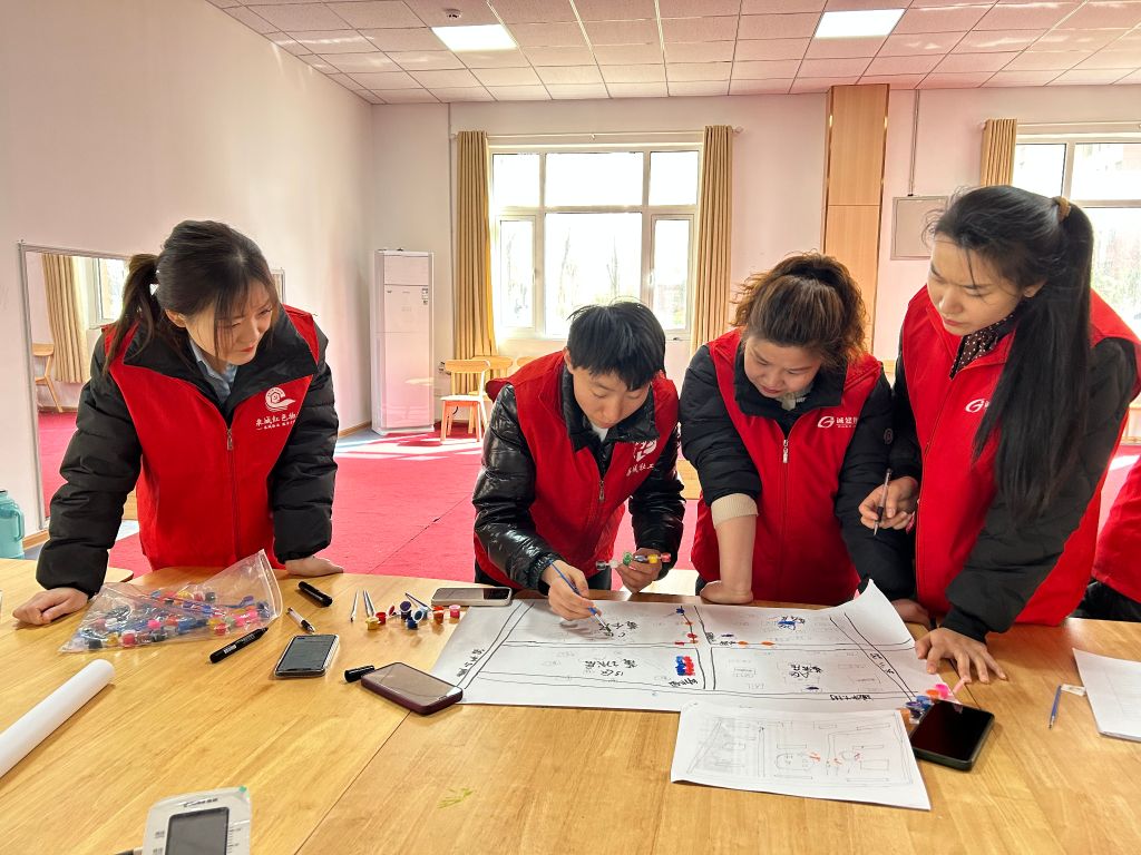 在上一节小组活动结束后,社工与与志愿者小组的骨干成员通过线上联系就本次专业技能培训进行了协商、讨论,根据志愿者们对实地服务需求和培训意愿,最终确定了如何与居民保持良好关系、常见健康监测仪器规范使用、入户探访技能三类学习培训。在活动开始,社工向小组成员介绍了本次小组活动的内容主要是对志愿服务技巧进行培训、探讨共谋志愿服务技能提升之路,小组成员在听完社工讲解的三类学习培训后表示都很“接地气”也表示很感兴趣。社工先以绘制社区资源地形图作为本次小组活动的热身运动,大家集思广益根据所处社区的位置、面积、特色、便民服务、社区景观等要素开始,志愿者们分工明确,但也有不同意见的志愿者争论,社工在聆听争议后,提示志愿者们可以在网上寻找有关的地图文献先绘制出基础社区资源地图、随后再梳理社区资源,给地图上色。在志愿者们沟通合作中虞麓花园小区区域位置、道路等轮廓开始慢慢浮现在纸上。