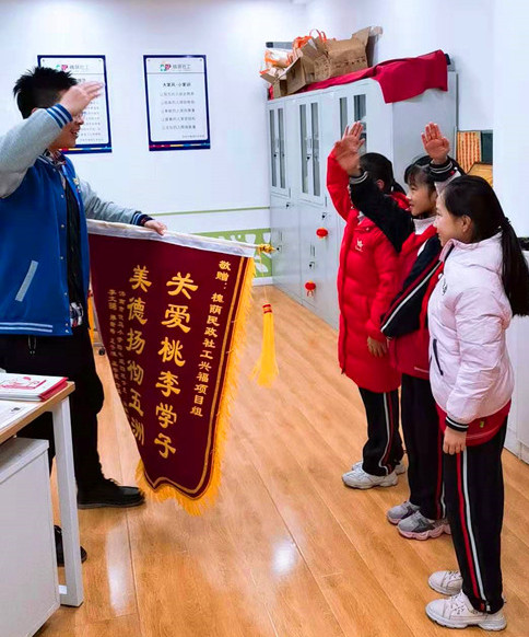 12月20日下午,由槐荫民政局购买,济南市历下区山泉社会工作服务社承接,派驻到兴福街道党群综合服务体的槐荫社工兴福项目组发生一幕感人的场面,3名槐荫区饮马小学四年级四班的学生课代表,将一面写有“关爱桃李学子,美德扬彻五洲”锦旗送到兴福项目组,由组长亲自接收。