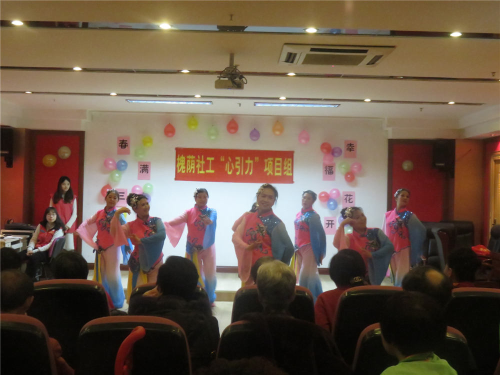 本次活动由服务对象自发组织,“心引力”项目组社工协助开展,引来辖区内众多居民的参与。活动现场热闹非凡,有曼妙绝伦的舞蹈,有婉转嘹亮的歌声,还有柔中带刚的太极剑,精彩的表演无一不赢得了台下观众的阵阵掌声。互动环节的“心有灵犀”游戏,也吸引了台下观众的热情参与。在欢声笑语中,联欢会也临近结束,大家似乎还意犹未尽,纷纷表示将吸取本次活动中的经验和教训,多多举办“居民自己”的活动。