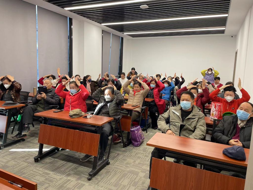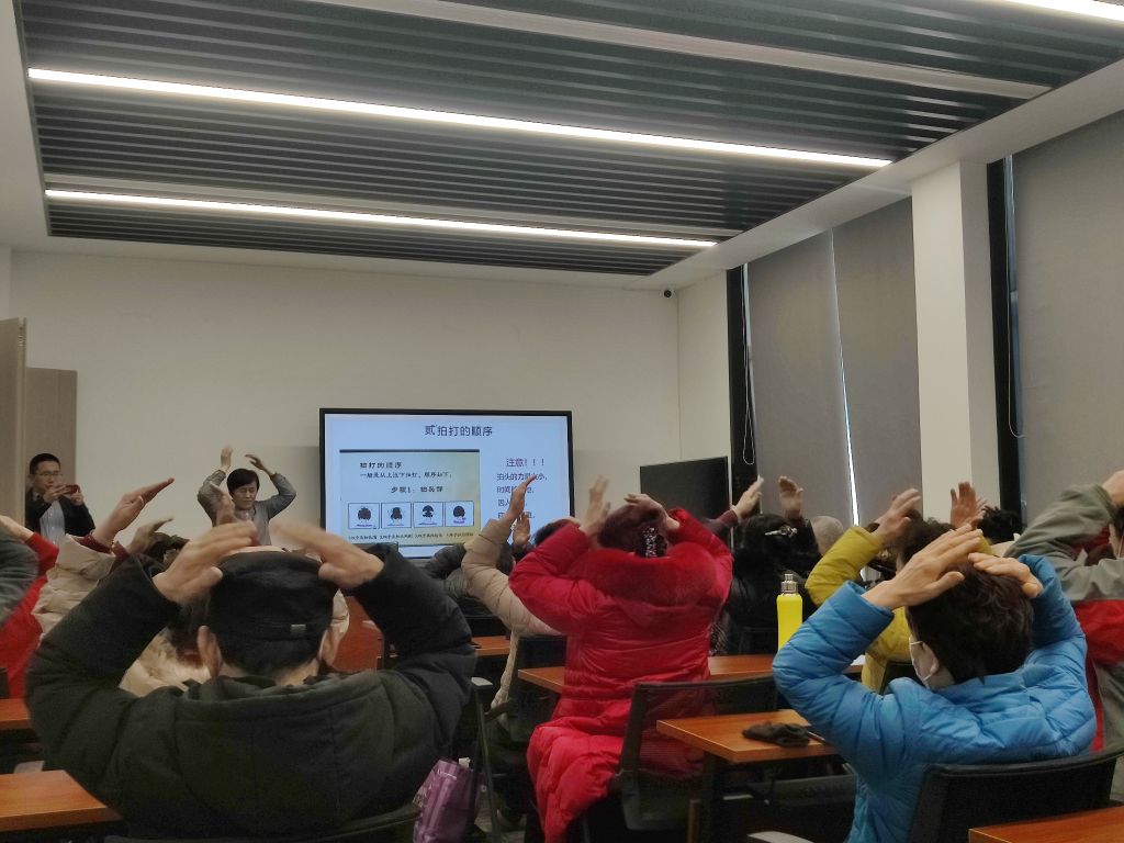 讲座现场,郭老师演示了经络拍打的具体方法和技巧,向居民介绍了经络拍打对于身体健康的作用和原理,还分享了一些日常生活中可以维持身体健康的方法和注意事项,包括如何改善生活习惯、保持情绪平稳、适当锻炼身体等方面的建议。