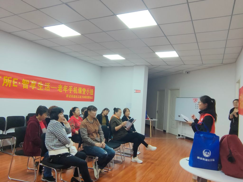 为帮助老年人进一步融入数字化时代,教会老年人使用智能手机,加快数字服务适老化改造,为老年人生活提供便利。10月13日,郭店街道社工站联合东城名郡社区开展“老有所E·智享生活”老年人手机课堂小组活动,从老年人的需求出发,切实解决老年人运用智能手机的困难,将助老行动落到实处。