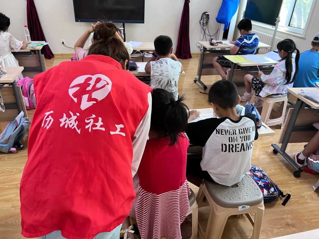 社区托管班内的儿童主要针对一年级到六年级儿童,辅导老师由社工及大学生志愿者担任,除了帮助孩子们完成暑假作业外,还开展了各式各样、生动有趣的活动,涵盖绘画、书法、表演等。正值暑假末期,此次活动主要为托管班的孩子做暑期作业结尾工作,社工在此起到一定的督促作用。社工在教室内一边看着孩子做作业,一边为孩子答疑解惑。“老师,元旦是几月几日啊”一名一年级的小朋友问道,社工引导孩子自己答出,一方面增强孩子的记忆力,另一方面锻炼孩子思考问题的能力。
