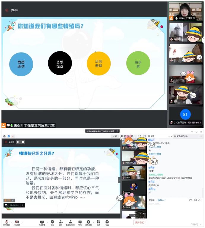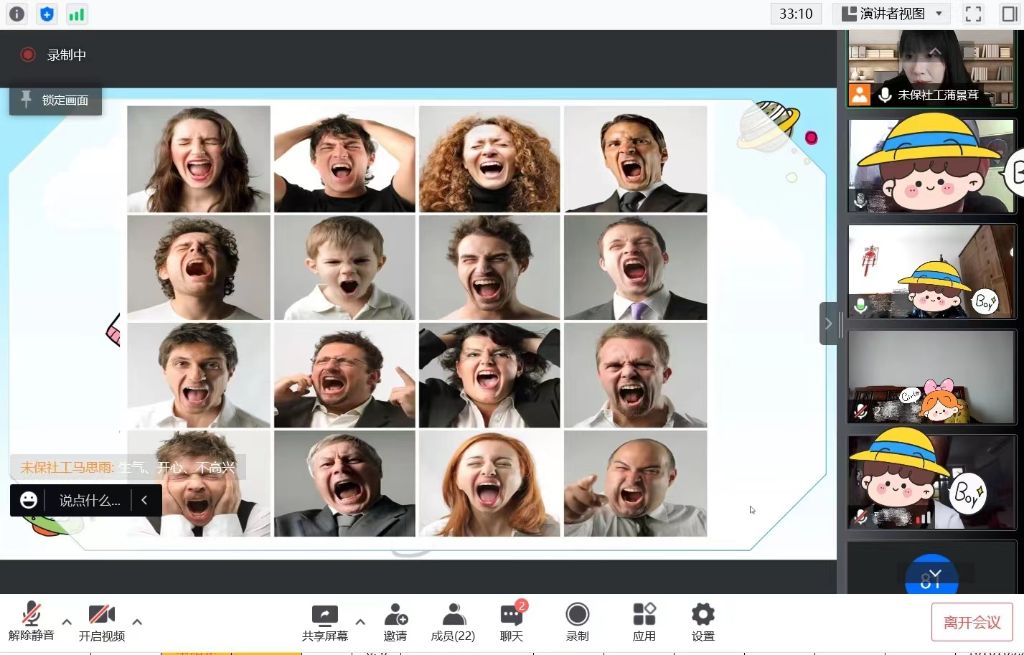 根据皮亚杰认知发展阶段理论,6-12岁的儿童正处于建立具体的逻辑思维能力,开始学习理性分析事物的阶段,在这样一个成长的关键阶段,儿童作为情绪的个体,情绪体验较多但控制能力不足,对于疫情的关注加之生活空间的缩小会让儿童在认知、情绪、行为、人际交往和躯体方面产生一些不良反应,5月14日,槐荫区未保中心开展“情绪魔法师”线上小组活动,采用小组工作的方式,为21名儿童介绍了情绪的相关知识,倾听他们在疫情期间的情绪体验,借助小组动力,帮助儿童了解、支持他人与自我的情绪表达,协助他们学习接纳并妥善处理自己的情绪,获得正确的认知发展。