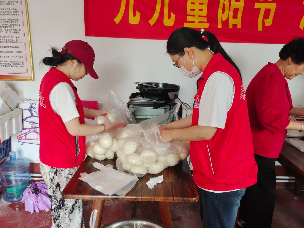 一大早,社工们就来到了幸福院,开始忙碌起来。大家分工合作,默契配合,帮助村里的工作人员洗菜、切菜、切肉、分装馒头。在大家的共同努力下,一顿丰盛的午餐便准备好了。随后社工向陆陆续续前来领餐的老人分发餐食,并叮嘱他们小心拿好,回家路上注意安全,同时做好领取记录工作。