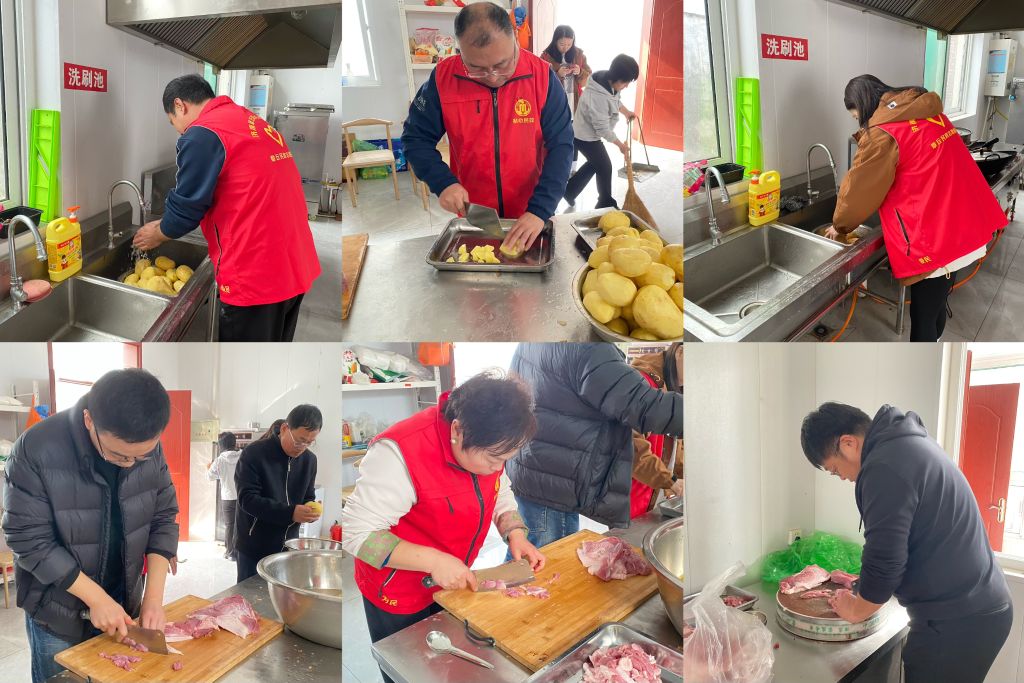 一大早,志愿者带着食材前往幸福院,大家一起搬下食材为老人做起了饭。社工积极参与,与志愿者分工合作,默契配合,有的洗菜、有的切菜、有的切肉,每一项助餐准备工作都干得井井有条。过程中,社工和志愿者互相分享平时煮饭以及参与志愿服务的经验,加深了解。上午11点,朱各务村幸福院已经是饭香扑鼻,老人们翘首以盼,等待今天的饭菜出锅。在社工的引导下老人们有序入座,丰盛的菜肴陆续上桌,老人们津津有味的吃了起来。