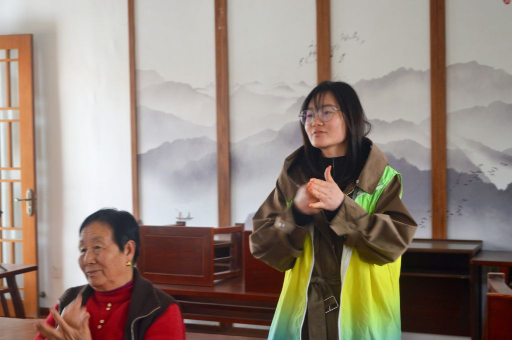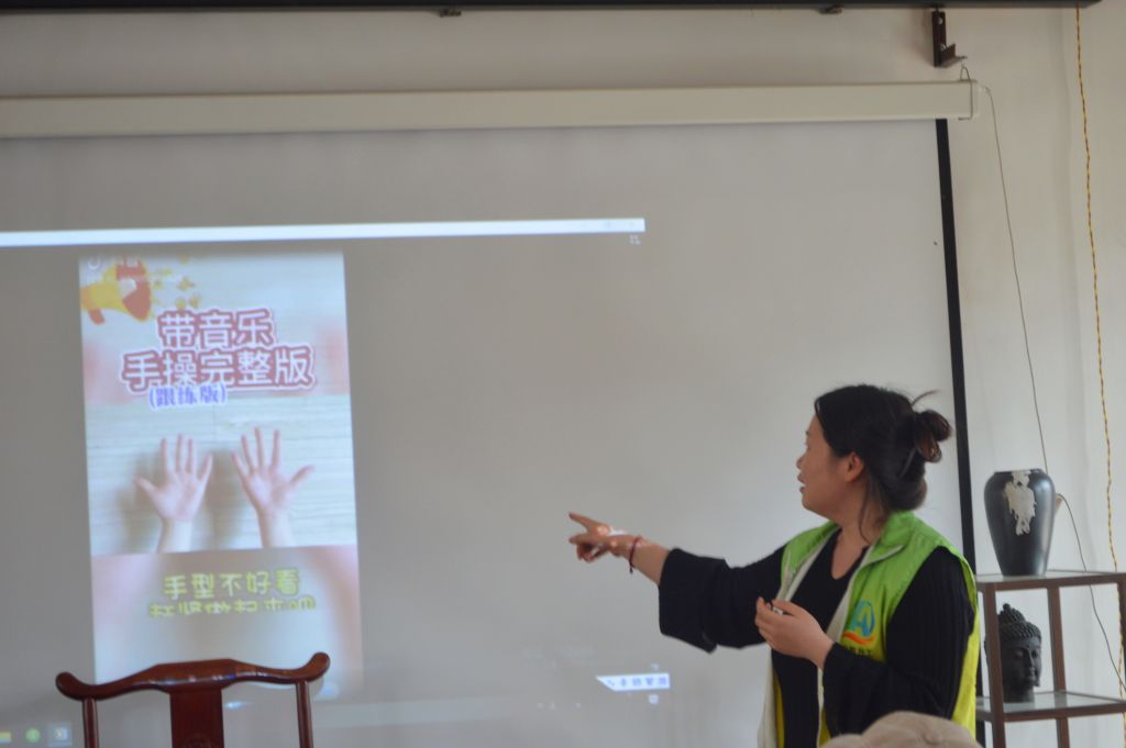 活动中,社工向组员以视频讲授的方式完整示范了本节手指操的基本流程,让组员对大致步骤有了初步的认识。随后,社工带领组员学习每个分解动作,组员们全都专心投入、用手比划着。对学习和接受能力稍慢的老人,社工耐心细致地一对一指导。在手指操分步教学中,社工小陈以每个动作为基础向组员传授相关健康知识,提升组员们对于脑健康的了解。