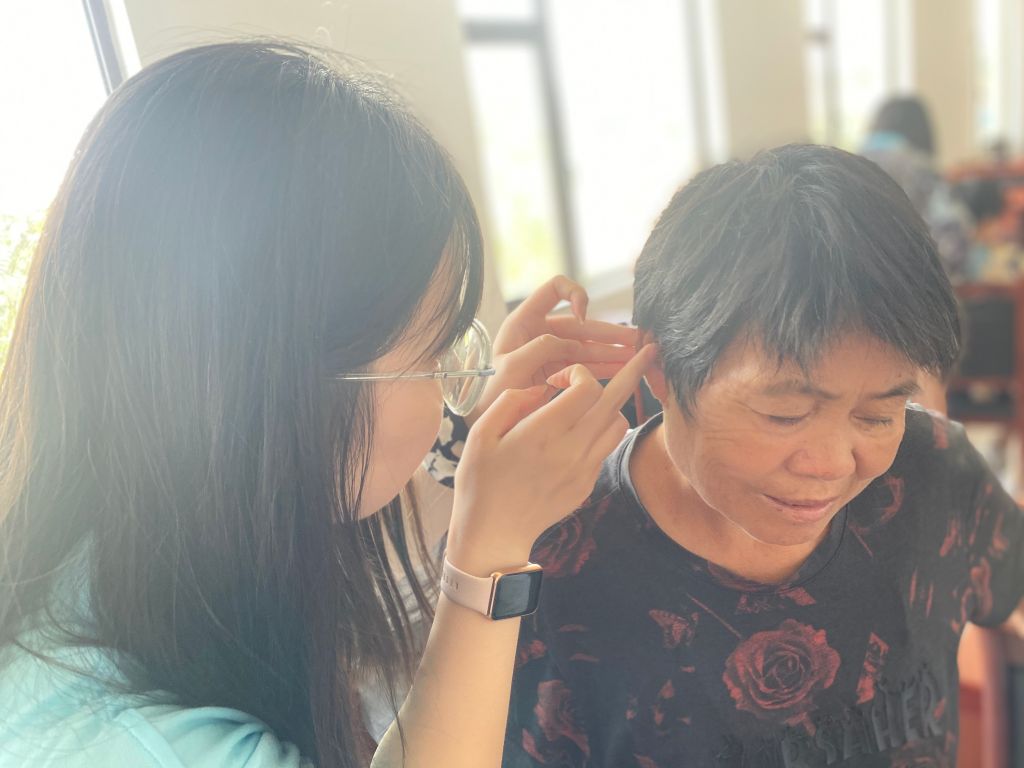 随后,医学生为现场老人开展测血压、耳穴压豆、肩颈推拿等多种形式的服务,让老人在感到温暖的同时感受中国医药文化的博大精深。最近睡眠不好的老人们听闻贴耳穴可以改善失眠,就跃跃欲试。医学生将比米粒还小的黑籽对准穴位贴上,就完成了耳穴压豆。“每天可以按揉一下敷贴的穴位,一般夏天贴2天左右可以自行取下”。医学生一边用拇指轻轻按揉穴位,一边告知相关注意事项。