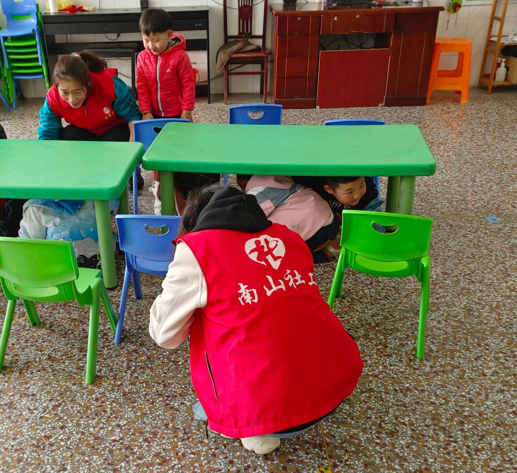 活动伊始,社工通过问答奖励的方式与儿童一起回顾上节小组活动内容,并讲解本次小组活动目标及活动主题——“地震”。其次,志愿者从地震的介绍、地震征兆、如何应对地震、如何自救互救四个方面展开讲解,着重为儿童科普了“如何自救互救”。地震发生时,要保持镇静。身处平房时,第一时间冲出房屋到空旷地带;身处楼房时,先找相对安全的地方躲避,震后迅速撤离。尽量选择厨房、卫生间等开间小、不易倒塌的空间或墙角、桌子等坚固的家具旁避震,避开屋内玻璃门窗、高处重物、易碎品及吊灯,用手或其他物品保护头部,身体蹲下或坐下,尽量卷曲,降低身体重心,抓住桌腿等牢固的物体。最后,活动现场进行模拟演练,检验儿童本节教育活动的学习成果。