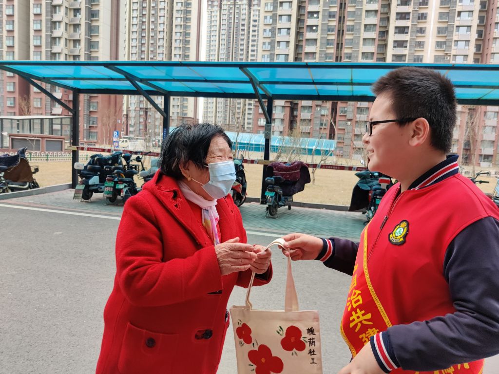 儿童志愿者向社区居民分享环保袋