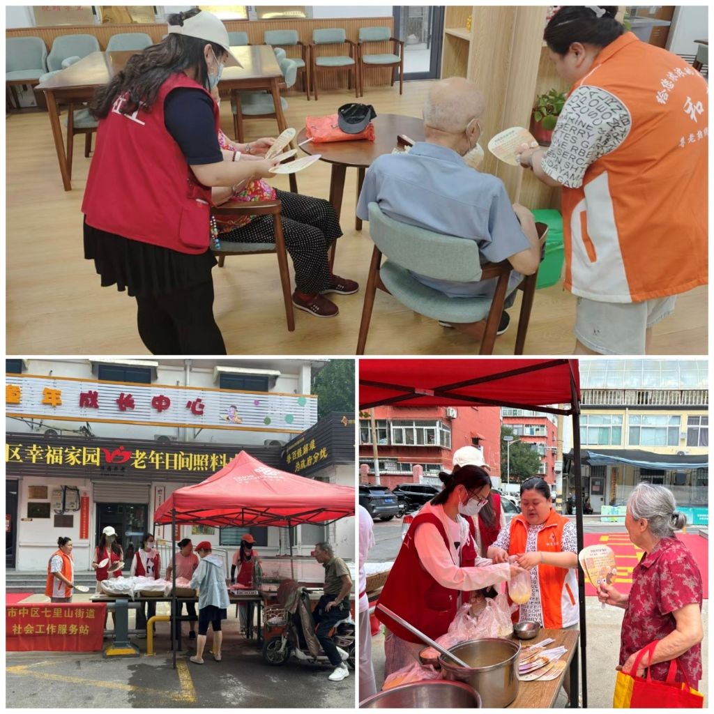 七里山街道社工站积极响应市中区民政局的号召,联合七东社区日间照料中心开展了长者助餐服务及宣传活动。活动现场,社工为老人打饭菜、盛粥,让老人们在享受美食的同时,感受到了无微不至的关怀。同时,工作人员还为老年人发放了防暑降温小扇子,这些清凉扇上印有市中区民政养老部门的网站、服务内容及联系电话,方便老人们随时了解和咨询养老服务。