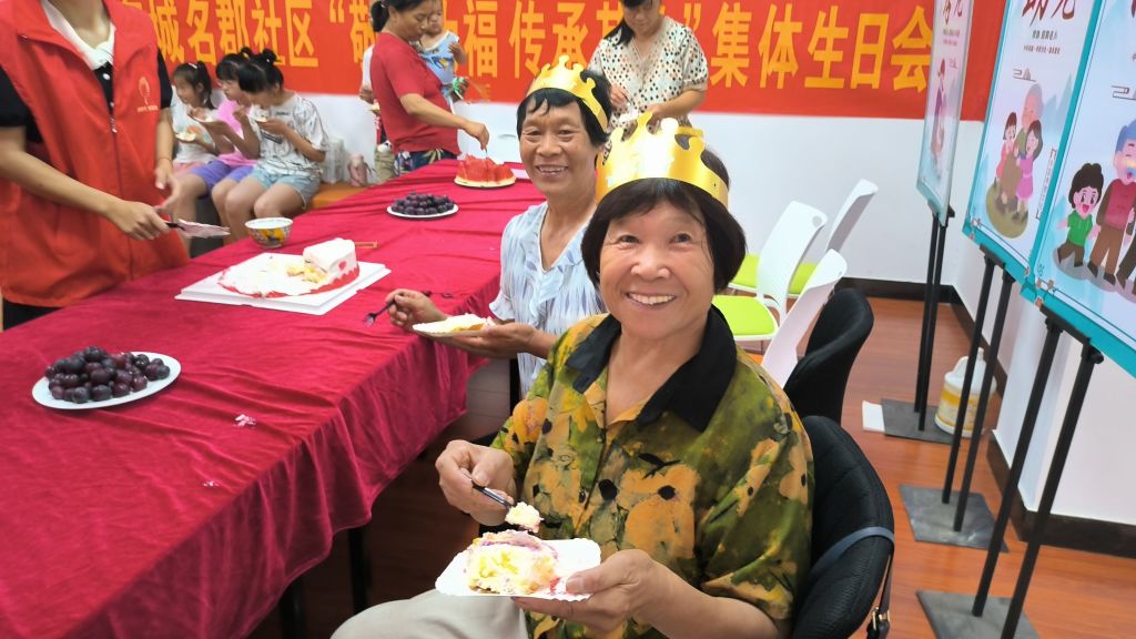 活动现场,社区邀请小朋友来给老年人送上祝福,老人和孩子们齐聚一堂,其乐融融。活动中,社工带领大家做健康律动游戏,在场的老人、小孩不时传出欢笑声,现场洋溢着一片欢乐祥和的气氛。之后社工端上蛋糕,点燃蜡烛,老人小孩们一起唱生日歌、许愿、祝福。在社工的协助下小朋友为老人送上生日小礼物,让奶奶们笑得合不拢嘴,现场很是热闹。社工和社区志愿者还给寿星们准备了代表“长命百岁”的长寿面,邀请寿星和他们的家人分享此刻的欢愉。活动结束后老人们纷纷表示集体过生日,温暖他们心窝的不是蛋糕,也不是生日礼物,而是大家对他们的关心和集体生日的氛围。
