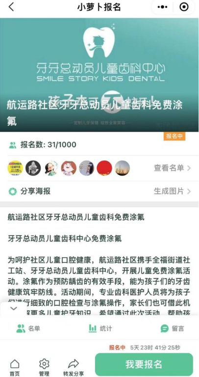 此次活动的报名通道将从2月24日开启,开放名额1000名,一直持续至3月3日,居民只需通过线上报名,就能免费参与其中。涂氟时间也会综合儿童家长时间,采取提前电话预约的形式。同时,活动内容丰富,设置了多个精彩环节。在活动期间,牙牙总动员儿童齿科中心会迎来专业齿科医护人员,他们将为孩子们提供细致入微的口腔检查,并进行专业的涂氟操作。