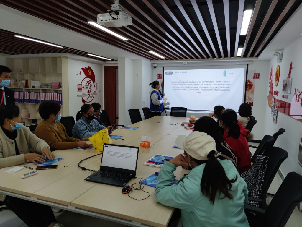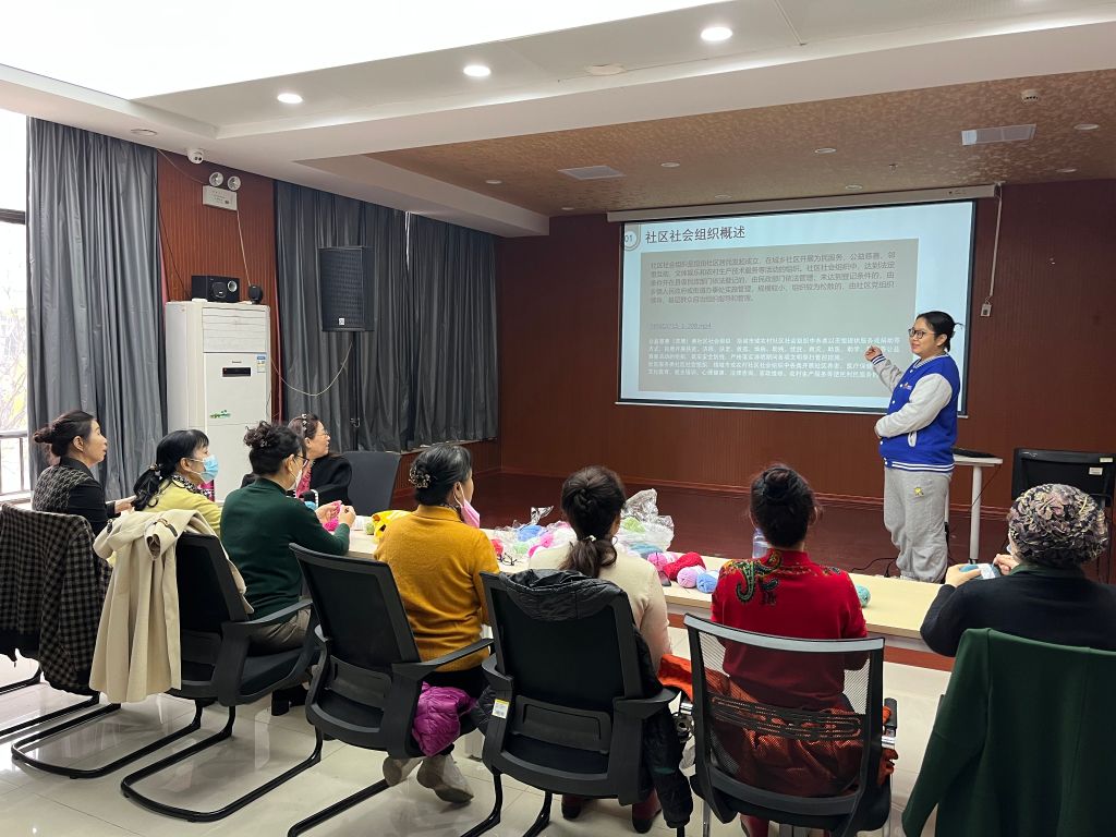 不广其基,而增其高者覆。社工在前期社区随访和日常兴福课堂活动开展中了解到辖区内社区骨干人员对社区社会组织的知识知之甚少。社工结合社区骨干人员的具体情况,综合分析后社工来到了金科城第一社区指间e智手机班通过ppt进行宣讲,针对社区社会组织是什么,形成社区社会组织是为了更好地参与社区服务两个角度进行了深入浅出介绍。随后,社工又在社工站内召集指尖生花手工志愿服务队成员进行了社区社会组织培训,培训采取PPT和共学小组相结合的方式进行。社工播放中国青年志愿者公开课视频,让社区骨干人员更便于理解社区社会组织的相关知识。
