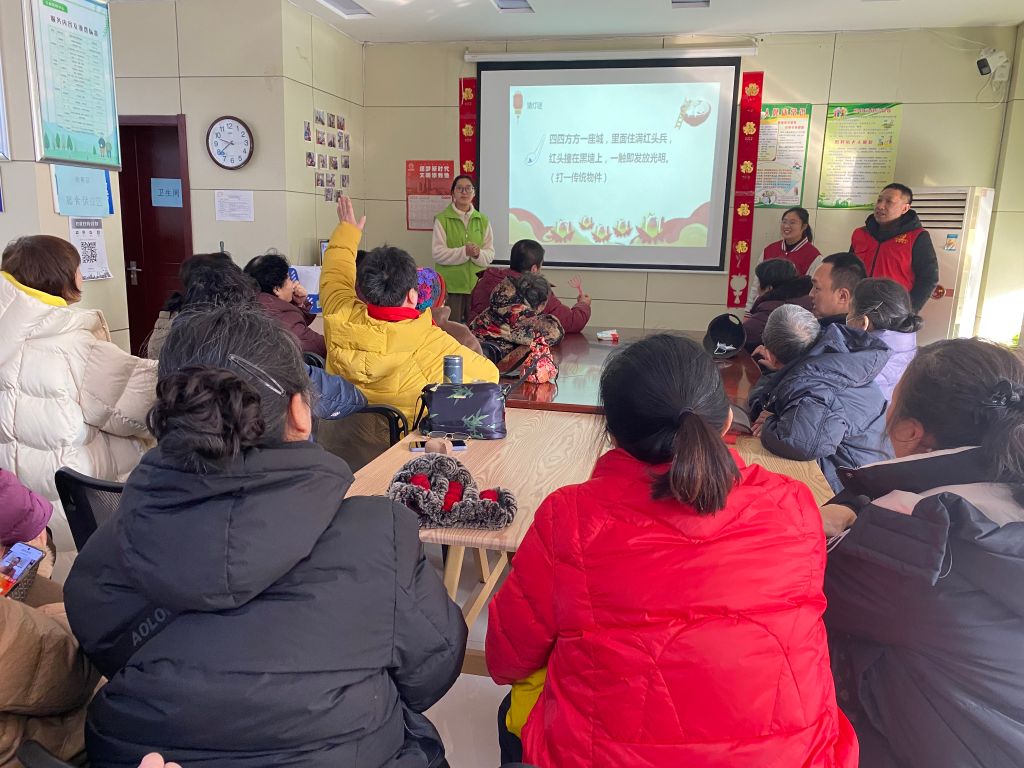 活动伊始,社工以生动有趣的方式,带领老人们遨游于元宵节的悠久历史与丰富习俗之中,让他们深切体会传统文化中那份独特的“年味”。猜灯谜环节,更是将活动推向高潮。灯谜内容涵盖生活常识、传统民俗和历史文化等,现场老人分成两组,共同沉浸于猜谜游戏所带来的紧张刺激与欢乐兴奋之中,他们或低头沉思,或互相讨论,竞相挑战谜语,现场时不时传来解开谜题后发出的欢呼声。社工还特别准备了实用奖品,让老人们在动脑收获知识的同时,也收获节日的惊喜。