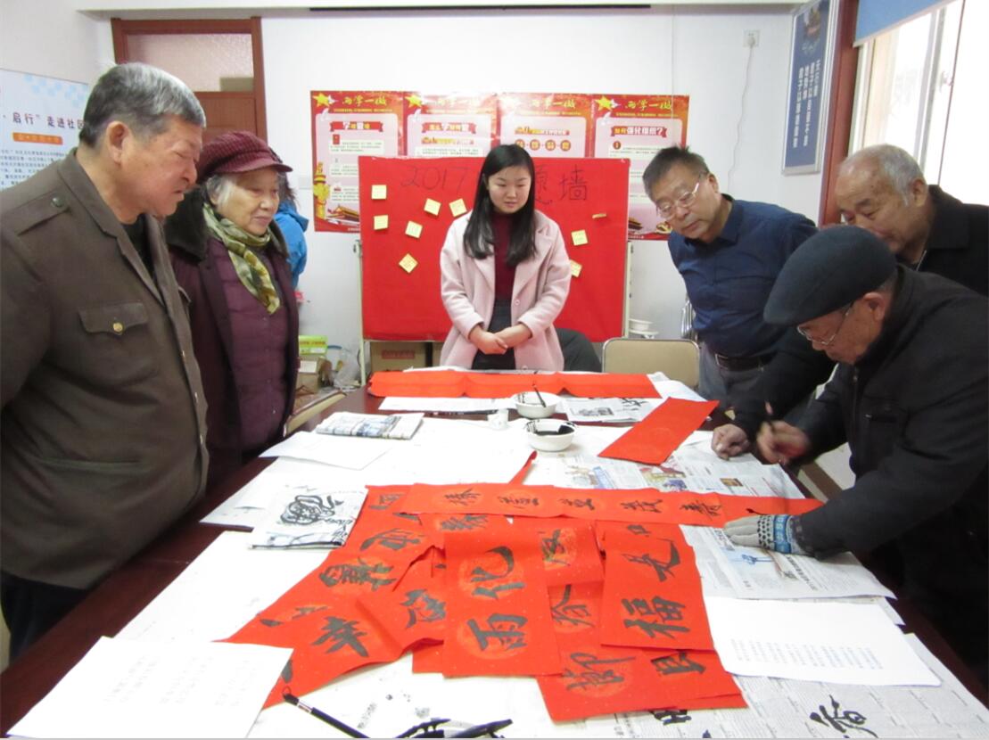 过年贴春联是我国的传统文化。为了迎接新年的到来,王官庄四区第一社区开始了迎新系列的第二个活动——“迎新春,写春联,送祝福”。2017年1月11日上午,居委会会议室里人头攒动,会议桌上铺满了喜气的红色春联纸,我们邀请了社区内的书法爱好者,大家一起挥毫书写新春的祝福。