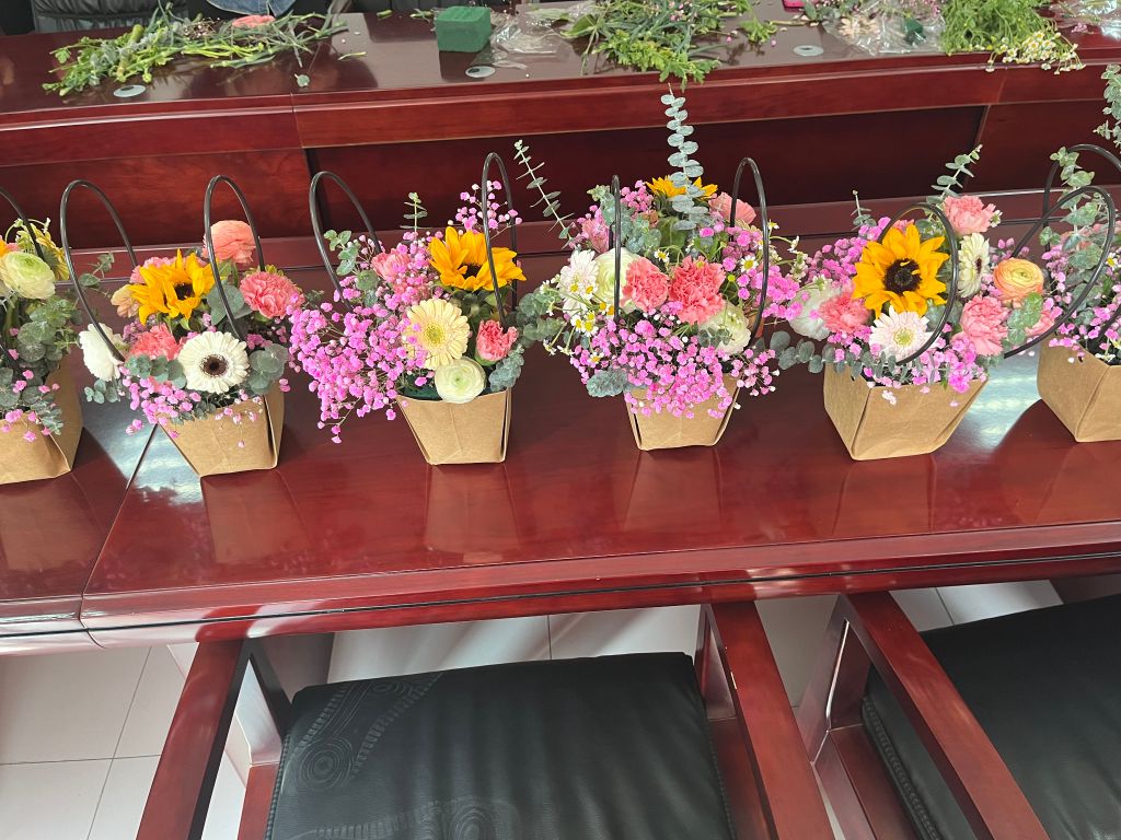 接下来,社工将花束、花篮、花泥依次发放到小组成员手中,社工给大家讲述了选花、养护、颜色搭配、造型等艺术插花技巧,还讲述了各种花所蕴含的花语和祝福。在社工的指导下,大家积极行动起来,根据不同的花材、颜色进行搭配剪裁。在一修一剪之间,桌上一盆盆细致精美、别出心裁的插花作品逐渐完工,让人仿佛置身一片花海,大家的脸上都洋溢着幸福灿烂的笑容。