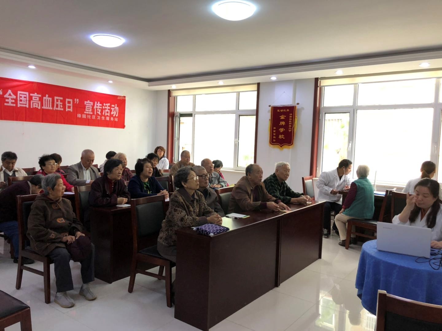 10月9日上午,绿园社区卫生服务中心的高卫主任携家庭医生杨大夫及护理人员来到社区,为社区居民发放调查问卷表,初步了解居民的身体状况及平时的用药情况。杨大夫围绕高血压的成因、平时的预防及常用药等几方面给居民讲解高血压的相关知识,让居民们对高血压的防治知识有了更一步的了解。活动现场还设立了咨询台,为到场的每一位居民免费测量血压。