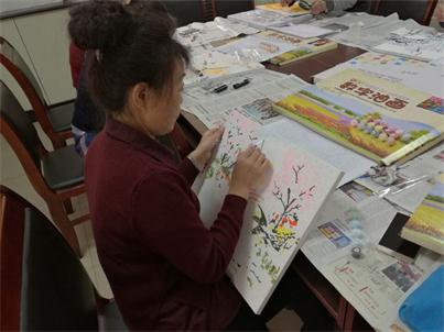 通过这几期油画小组的学习现在社区居民到画室后有序入座,相互分发制作数字油画的工具。居民们通过社工这几期的指导都基本上掌握了绘画的技巧。社区居民的绘画作品也初见成果,有玫瑰之约、江南水乡、抱陶女等一幅幅色彩斑斓、活泼生动的数字油画相继诞生。