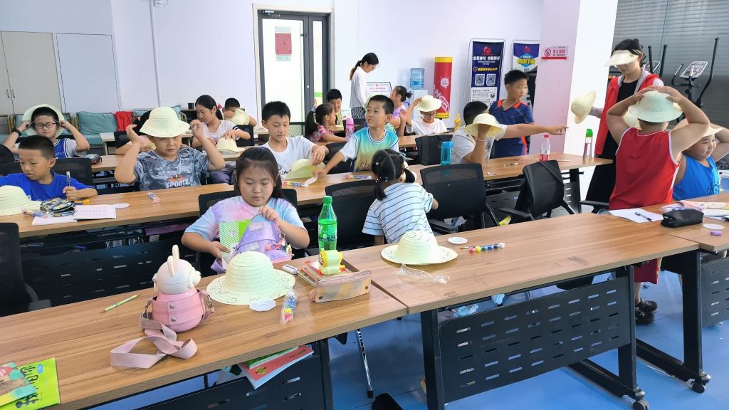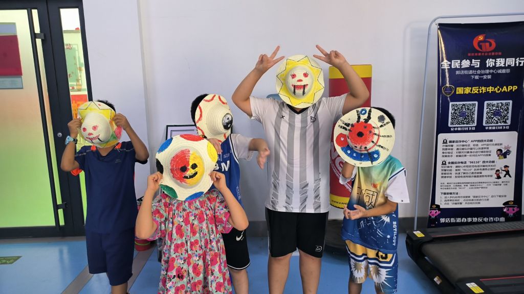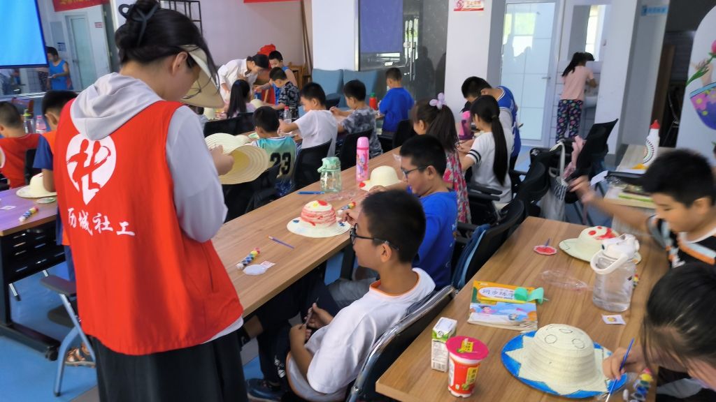 活动开始,社工首先引导组员简单地回顾了上节小组活动的内容,便向大家展示本节课要学习的手工作品--草帽。社工为大家讲解草帽是用水草、麦秸等物编织而成,主要用来遮挡太阳,被沿用了数百年,也是广大农民群众辛勤劳作的象征。接着,社工和志愿者将手工材料分发给组员们,小朋友们拿到草帽后,都迫不及待地发挥自己的创造才能,相互帮助调颜料、绘图和上色。活动过程中,成员注意力集中,参与热情高涨,用画笔涂鸦为自己的帽子锦上添花,不一会儿制作出了一个个独一无二的作品。制作完成后,大家开始互相试戴,摆出各种姿势拍照留念,有的小朋友还开发了帽子新戴法,戴在脸上开始了表演。妙趣横生的彩绘草帽活动,不仅释放了孩子们的想象力,还培养了大家对色彩的感知力,让他们在色彩和造型的创意中,天马行空,肆意发挥,发展创造力!